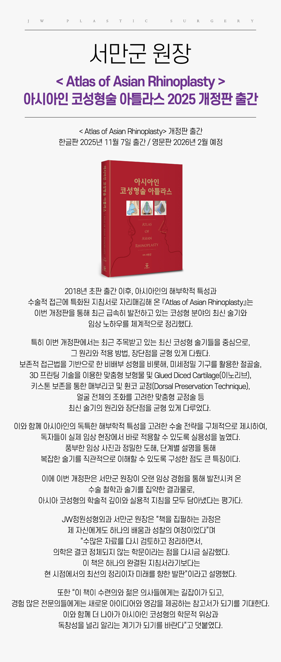 JW정원성형외과 서만군 원장, ‘Atlas of Asian Rhinoplasty(아시아인 코성형술 아틀라스)’ 개정판 출간